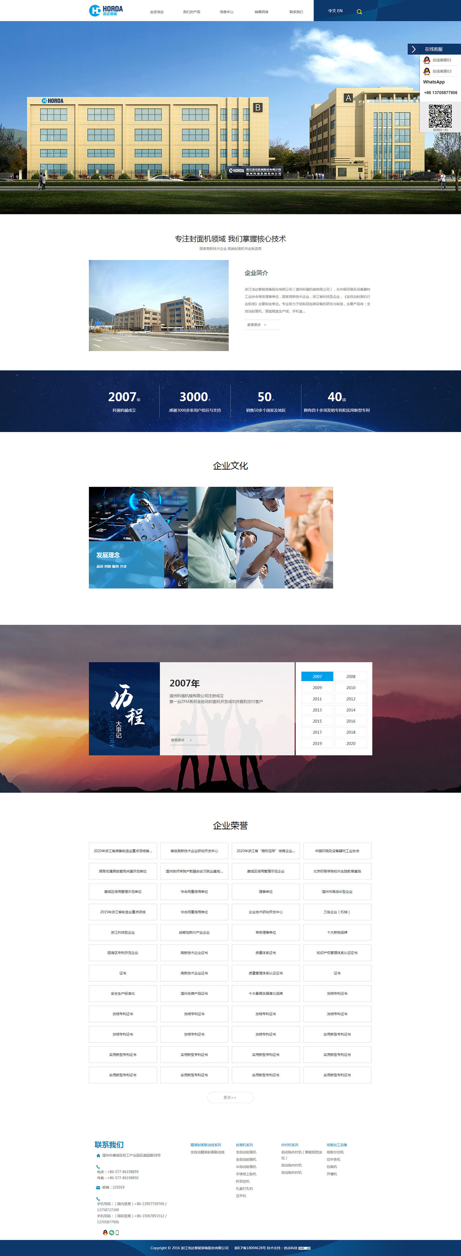 浙江浩達(dá)智能裝備股份有限公司(溫州科強機械有限公司),為中國印刷及設(shè)備器材工業(yè)協(xié)會常務(wù)理事單位,國家高新技術(shù)企業(yè),浙江省科技型企業(yè),《全自動封面機行業(yè)標(biāo)準(zhǔn)》主要制定單位。專業(yè)致力于紙制品包裝設(shè)備的研發(fā)與制造,主要產(chǎn)品有:全自動封面機、酒盒煙盒生產(chǎn)線、手機盒生產(chǎn)線、上膠機、紙板分切機等,產(chǎn)品通過了歐盟CE認(rèn)證,并擁有多項國家專利,適用于印刷包裝企業(yè)大批量生產(chǎn):白酒、香煙、月餅、茶葉、手機、內(nèi)衣、工藝品、化妝品等外包裝盒及文件夾、臺歷、筆記本、精裝書封面等等,不但能全面提升產(chǎn)品質(zhì)量和檔次,而且大大提高了生產(chǎn)效率。